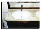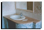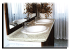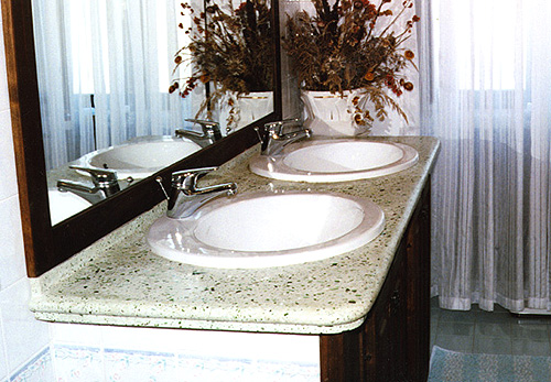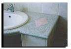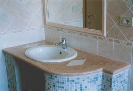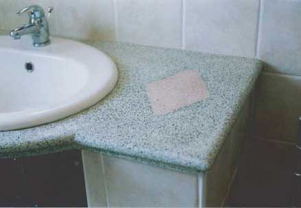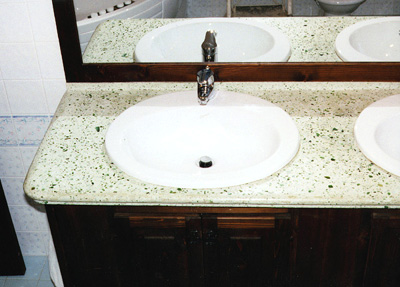 Le foto documentano un piano per bagno realizzato in cemento e graniglia di vetro colorata |